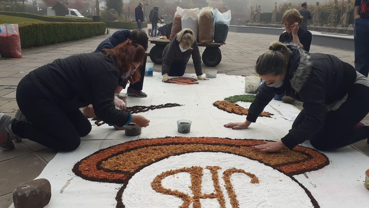 Eles foram confeccionados com serragem colorida e flores em frente à igreja matriz