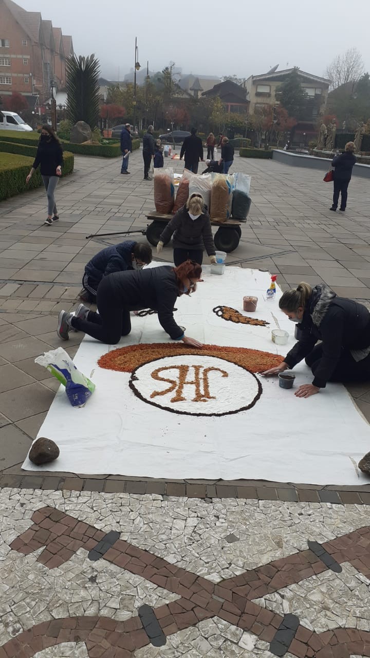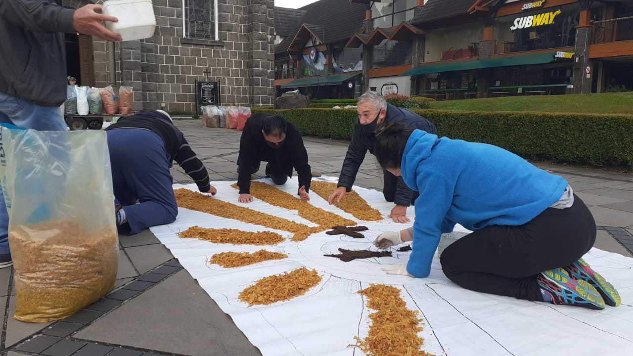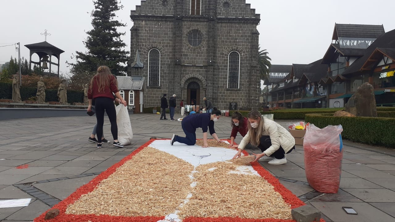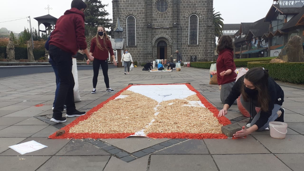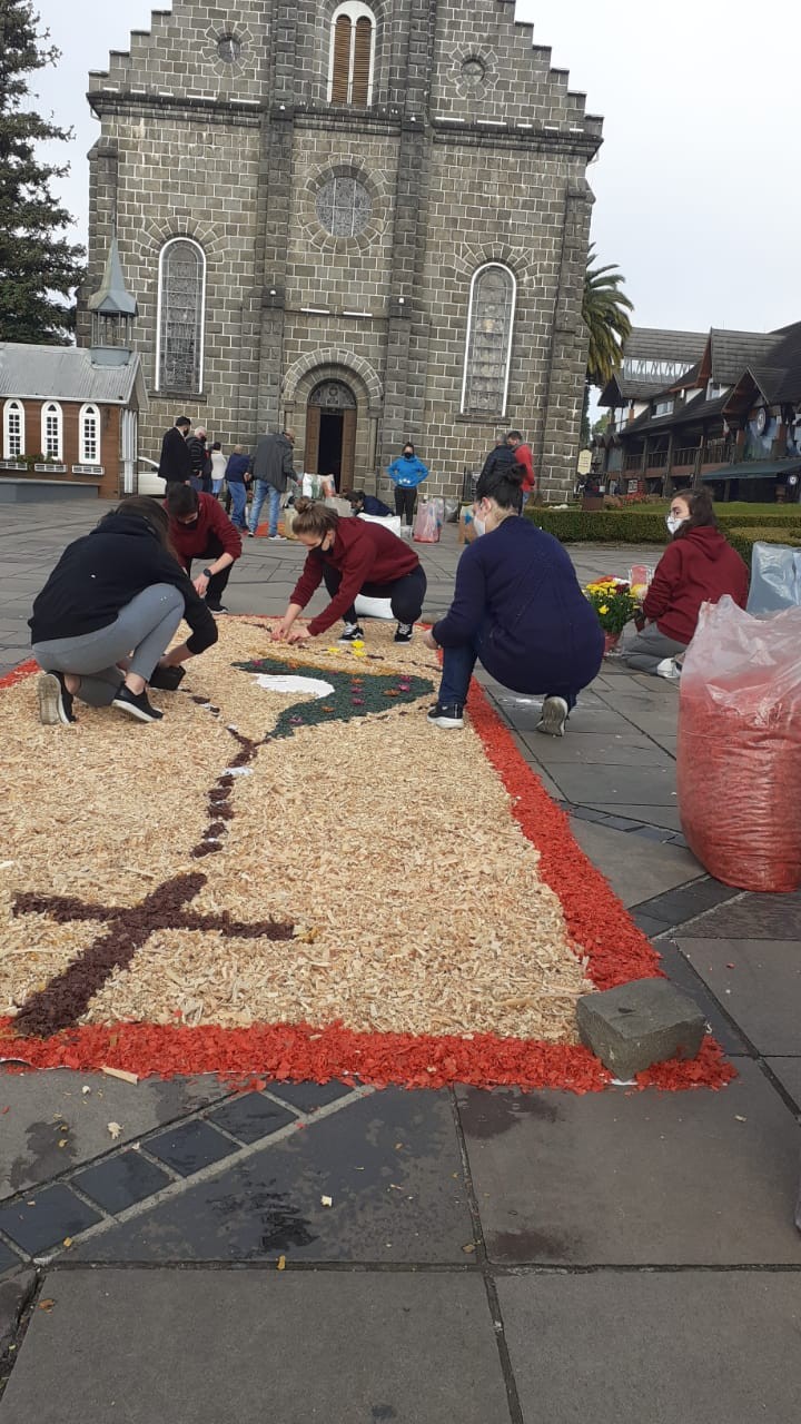 Três grupos da Paróquia São Pedro estiveram envolvidos na produção dos tapetes coloridos em comemoração ao dia de Corpus Christi. Eles foram confeccionados com serragem colorida e flores em frente a igreja matriz.