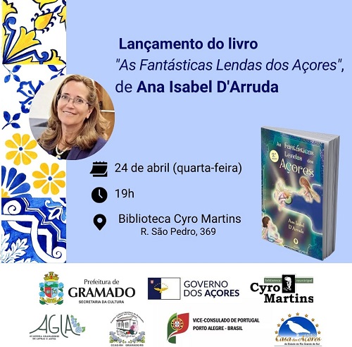A escritora açoriana Ana Isabel D’Arruda lança em Gramado, nesta quarta-feira (24), às 19h, o livro Fantásticas Lendas dos Açores, na Biblioteca Cyro Martins. A realização é do Centro Cultural Açoriano/Casa Portuguesa de Gramado, AGLA -Academia Gramadense de Letras e Artes e Biblioteca Cyro Martins