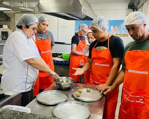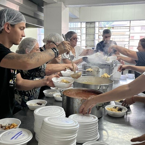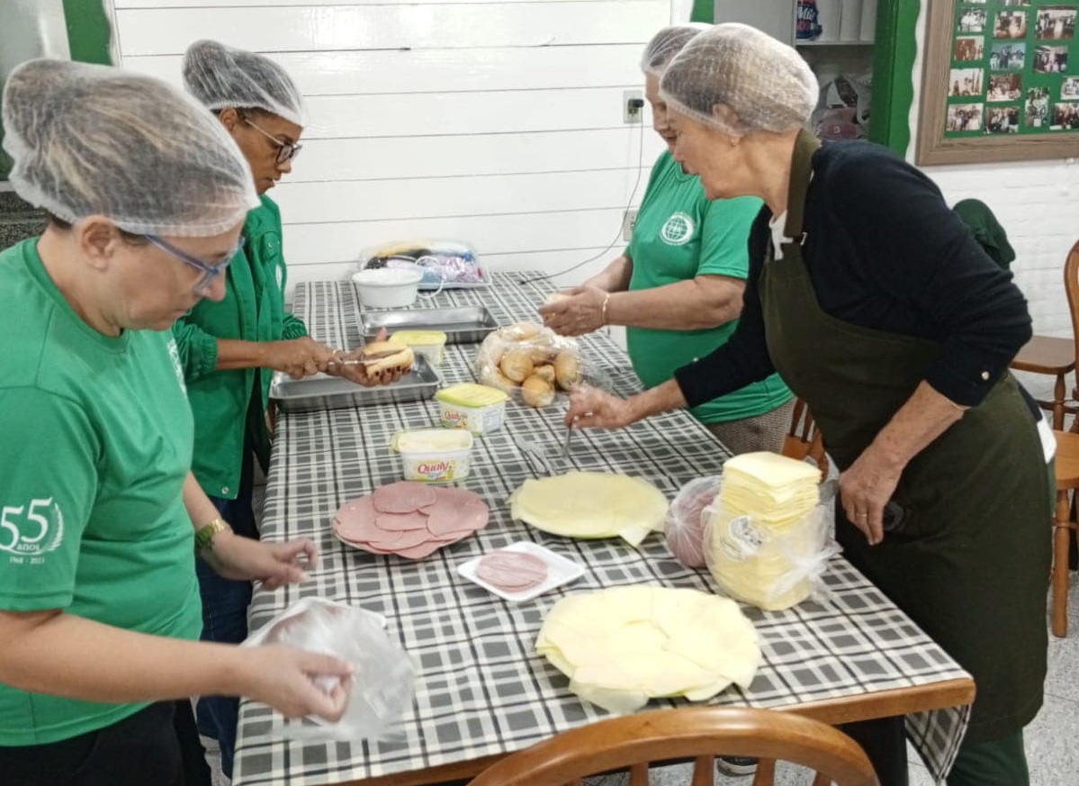 Nas fotos, os integrantes do Orbis Gramado (abaixo) produzindo refeições em sua sede, e abaixo um mutirão na cozinha da Sociedade Recreio Gramadense e os alunos do Projeto RS Qualificação (parceria com a Secretaria Estadual de Trabalho, Secretaria Municipal de Inovação e Senac)